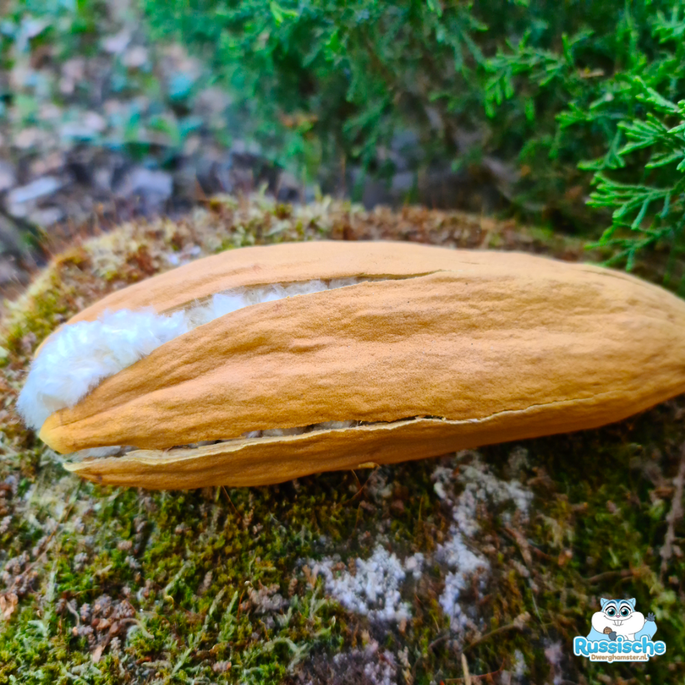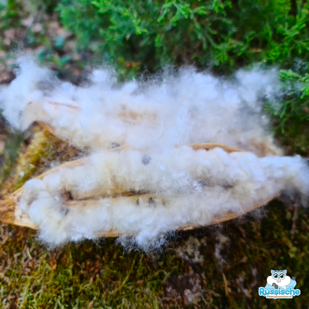 Maar waarom zou nestmateriaal verteerbaar moeten zijn? Het is niet om te eten, maar om in te slapen toch? Hier komen we bij een interessant punt! Er zitten namelijk zaadjes in de kapok verstopt die de hamsters erg lekker vinden. Nou wordt er beweerd dat als de hamsters de zaadjes hamsteren of opeten ze ook grote de kapok vezels binnen krijgen. Daar heb ik dus naar gekeken en ik laat in de video zien dat dit vrijwel onmogelijk is. Ten eerste eten de hamsters niet het gehele zaadje op, maar breken deze open en eten alleen het binnenste deel op. Ten tweede als ze de zaadjes al hamsteren en er zouden al vezels meekomen dan worden deze in de wangzakken gestopt en niet in de mondholte. Zou een hamster om welke reden dan ook een klein deel kapok binnen krijgen dan zal deze weer uitgepoept worden.