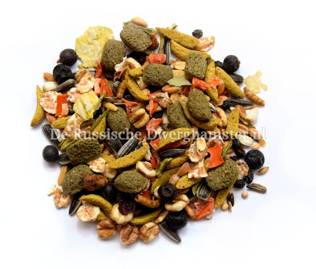 Meng je je voer voor eigen gebruik dan is er dus niks aan de hand. Mengen van meerdere hamstervoeders die op de markt verkrijgbaar zijn kan ook. Kijk altijd naar de samenstelling van de hamstervoeders. Je kunt bijvoorbeeld twee voeders met elkaar mengen die elkaar aanvullen. Zo meng ikzelf bijvoorbeeld voer dat geen meelwormen bevat met voer dat wel meelwormen bevat of meng ik expres extra pompoenpitten door voer dat zonnebloempitten bevat. Door dit laatste te doen breng ik bijvoorbeeld de twee vetzuren omega 6 en omega 3 met elkaar in balans. Als je drachtige of zogende dieren hebt kun je bijvoorbeeld ook twee voeders nemen die een hoog vetgehalte hebben en door elkaar mengen. Het voorbeeld van mengen in in de meeste gevallen de extra variatie, omdat fabrikanten verschillende ingrediënten gebruiken. Qua voedingswaarde schiet je er alleen met strategisch mengen iets mee op, dus als je echt gericht kijkt naar wat de een mist en de ander wel heeft.